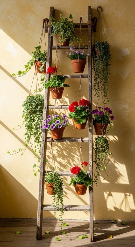Repurpose an old ladder into a hanging plant display. Use sturdy twine or metal hooks to hang pots from each rung. This setup fits perfectly in narrow spaces or balconies. It’s creative, affordable, and instantly eye-catching.