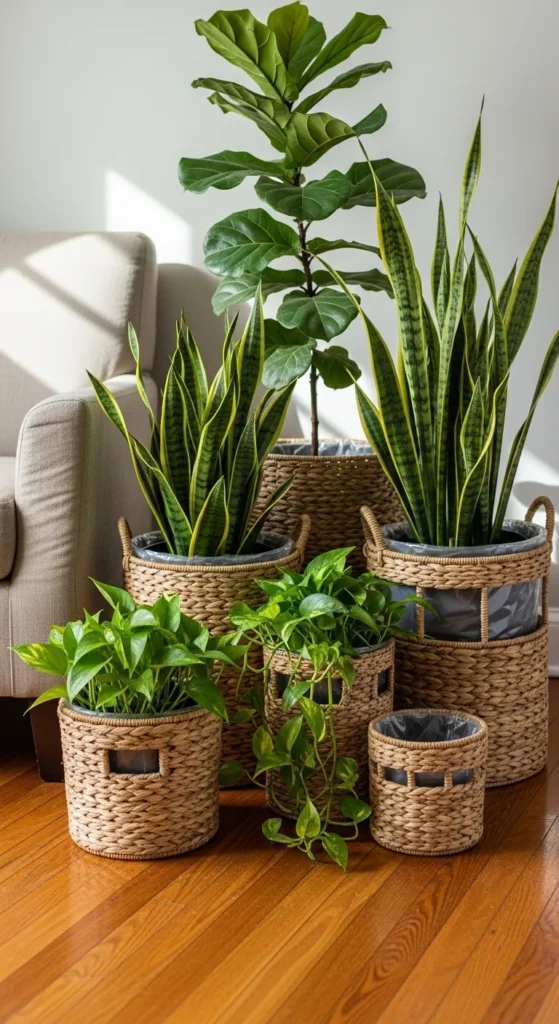 Baskets add warmth and texture to any space. Use woven rattan or seagrass baskets for your larger indoor plants like peace lilies or fiddle-leaf figs. To prevent leaks, line them with plastic trays or repurpose old grocery bags. You can even spray a clear waterproof sealant inside. This mix of natural fiber and greenery feels cozy and organic. It’s also a budget-friendly way to dress up plain nursery pots without replacing them.