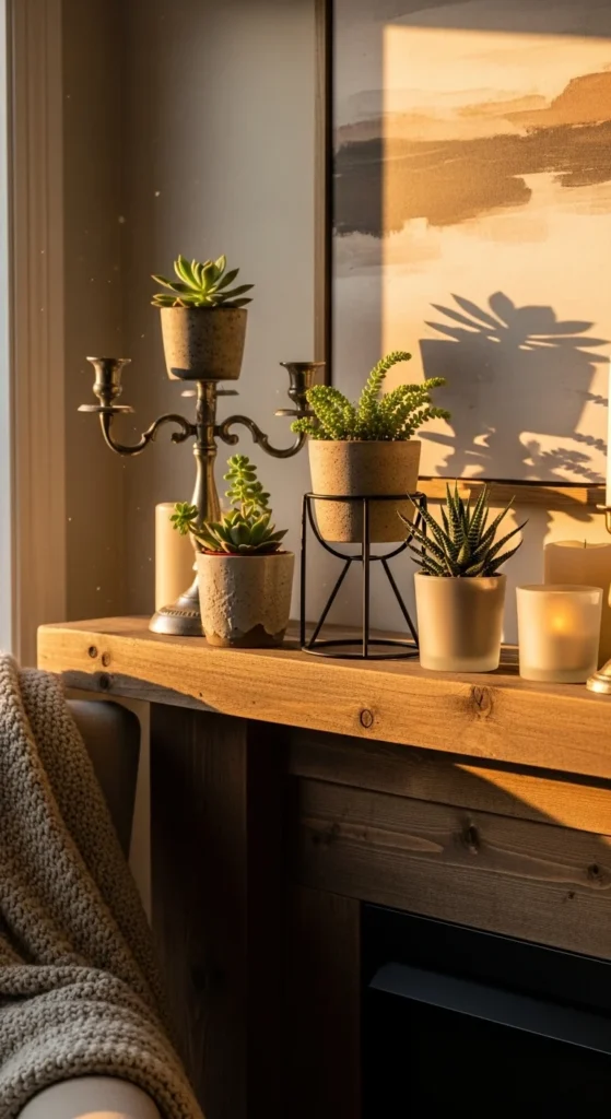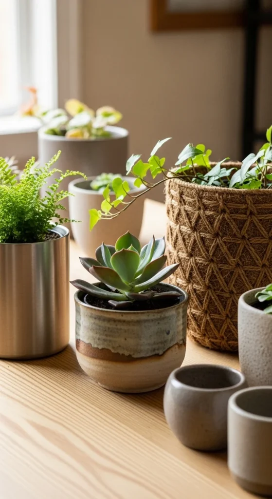 Mixing materials keeps your display interesting. Combine metallic pots with woven baskets and ceramic pieces. Keep one color consistent, like all neutral tones, to tie it together. This layered look feels curated and personal.