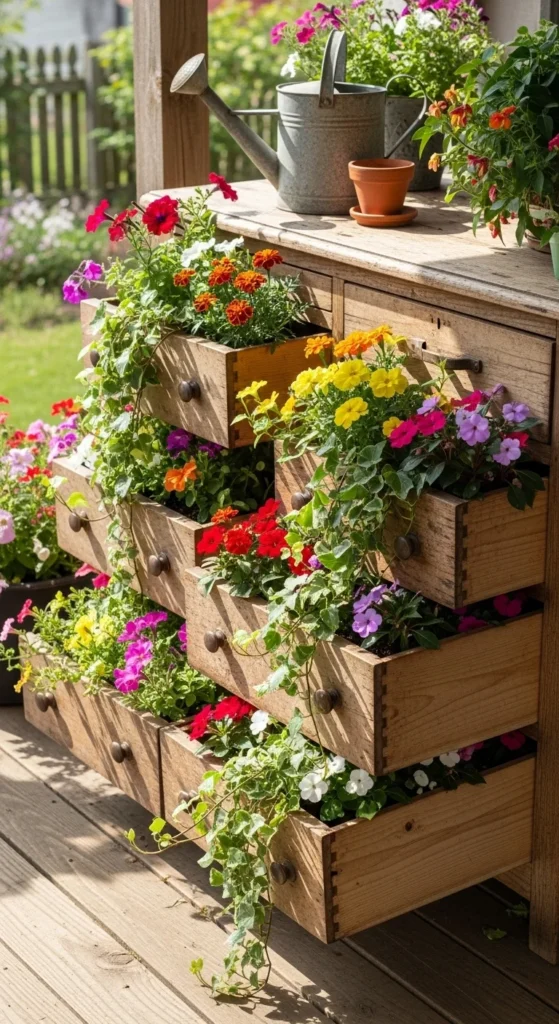 Give old furniture new life by turning drawers into planters. Line with plastic or landscape fabric, fill with soil, and add flowers or herbs. Stack or stagger them for a cottage-style look that’s creative and sustainable.