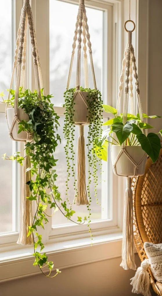 Hanging planters save floor space and add layers of greenery. Use macrame hangers for a relaxed, handmade look. They’re easy to DIY with cotton rope and a few knots. Try hanging trailing plants like pothos, philodendron, or string of pearls for dramatic effect. Combine two or three at different heights for a cozy corner accent. The hanging setup works great in small apartments or bathrooms with good light.