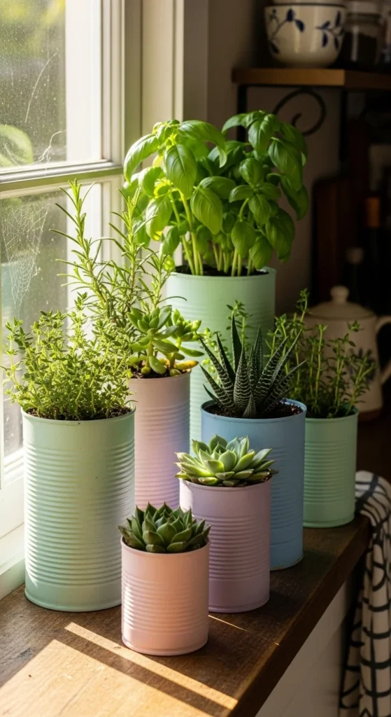 Old coffee or soup cans make charming planters once cleaned and painted. Drill a few drainage holes at the bottom, and you’ve got stylish mini pots for herbs or small succulents. Paint them in muted tones or metallic spray paint for a polished finish. This DIY idea costs almost nothing and reduces waste. Group three or four tins together on your kitchen windowsill for a cheerful, rustic touch.