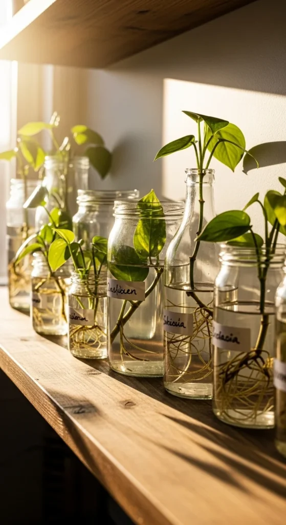 Glass jars are perfect for water propagation or minimalist displays. Place cuttings of pothos, monstera, or philodendron in water-filled jars. It’s mesmerizing to watch roots develop over time. Reuse mason jars or drink bottles for a zero-cost setup. Group different heights for a decorative touch. The glass-and-green combo looks clean and calming, especially on shelves or desks.