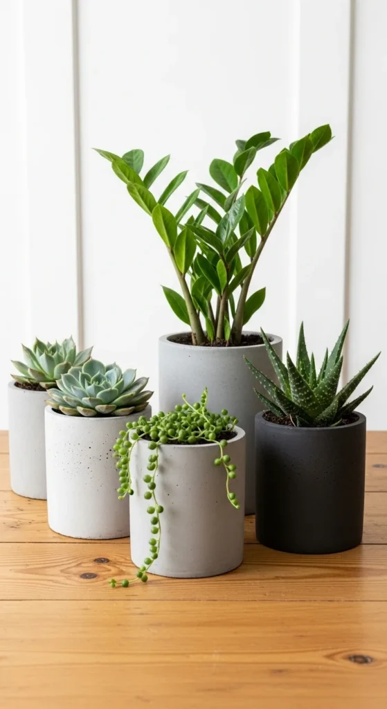 Concrete pots give a sleek, modern edge. You can buy them or make your own using molds and cement mix. They work beautifully with structured plants like snake plants or rubber trees. Add felt pads underneath to protect surfaces. For a softer look, place them next to warm textures like woven placemats or linen curtains. It’s a stylish way to contrast natural green with raw material tones.