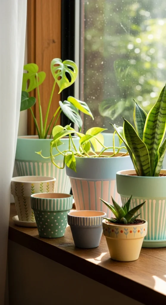 Pick a color palette and stick to it. Whether neutral, pastel, or bold, matching pots create visual harmony. Use spray paint to unify mismatched containers. Choose greens and whites for calmness or bright tones for playful energy. This trick ties your plant display together, making it look intentional and tidy.