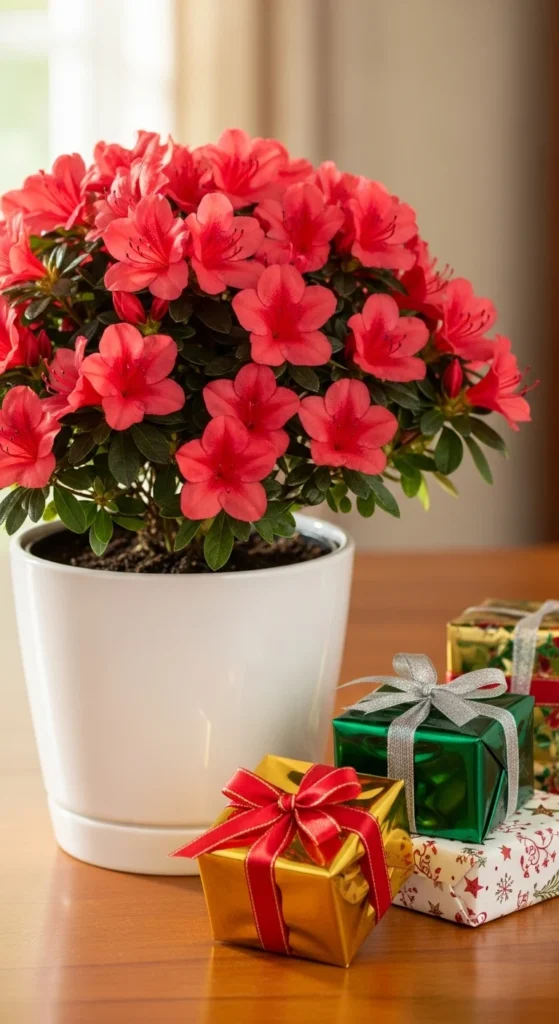 Azaleas bloom generously with red, pink, or white flowers during cooler months. They prefer bright, indirect light and moist soil. Use them to decorate entryways or fireplace mantels. After flowering, you can move them outdoors in spring to keep them thriving for next year.