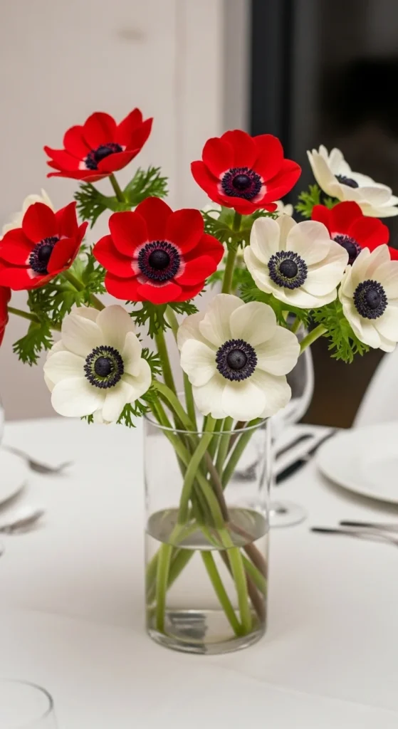 Anemones add a modern flair with their bold colors and contrasting centers. They pair beautifully with evergreen sprigs and berries. Keep them in cool water and change it often to extend freshness. Their cheerful faces instantly brighten holiday gatherings.