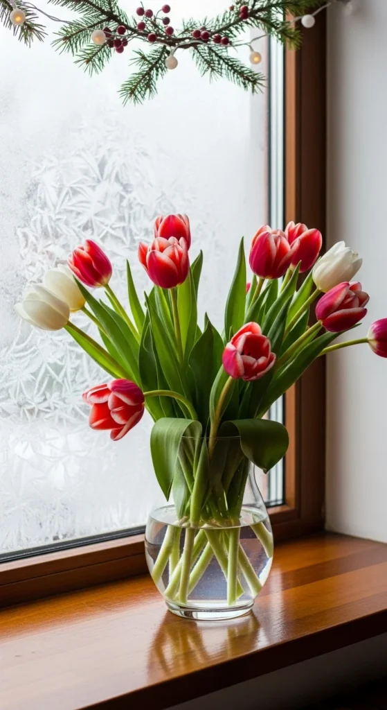 Tulips add a clean, modern look to winter arrangements. Though typically spring flowers, they’re available in winter from florists. Their simple elegance pairs well with pine or eucalyptus. Cut stems diagonally and refresh water often to enjoy them longer indoors.