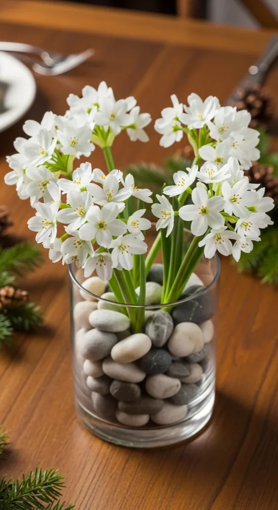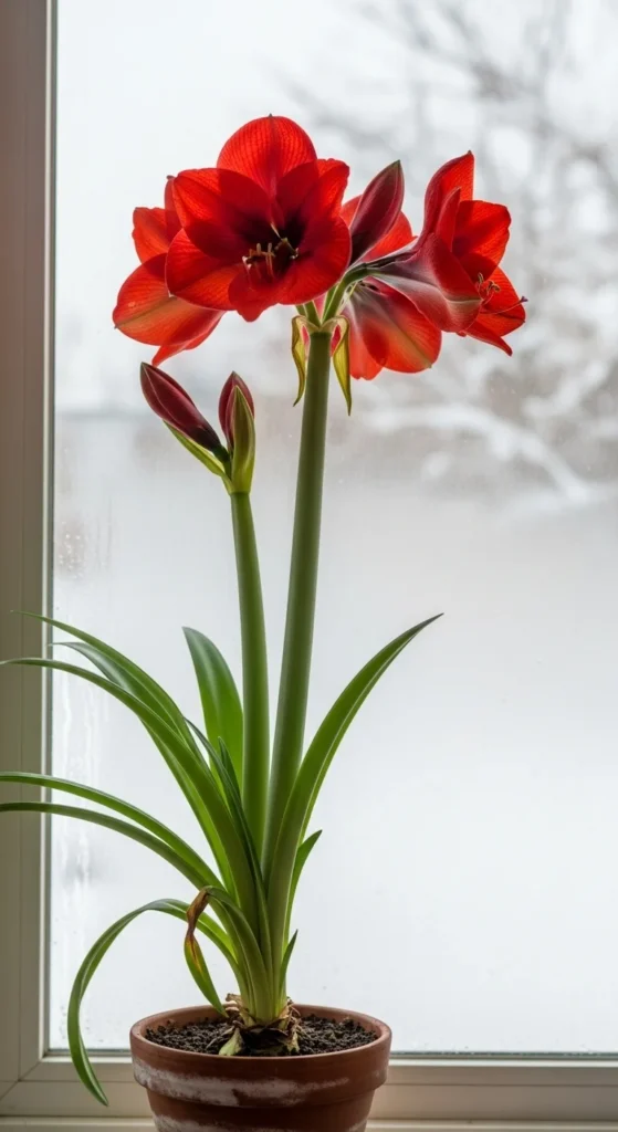 Amaryllis flowers add drama and elegance. Their tall stalks and bold blooms make them ideal centerpieces. Start bulbs indoors about six weeks before the holidays for perfect timing. Water sparingly until shoots appear, then regularly as they grow. For a simple look, place bulbs in a glass vase filled with pebbles and water to showcase their beauty.
