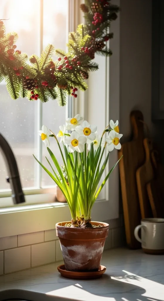 Narcissus, or daffodils, are symbols of renewal and light. Grow them indoors in pots or water-filled vases. Their scent and delicate blooms bring brightness to gloomy days. Start bulbs in early winter to have flowers ready by the holidays.