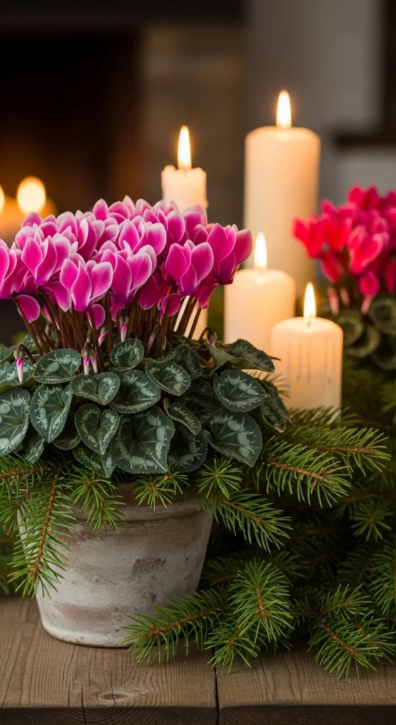 Cyclamen’s upturned petals look like butterflies. Their compact size and unique leaves make them ideal for tabletops or windowsills. Keep them in bright, indirect light and water from the bottom to avoid rot. Cyclamen adds a soft pop of color in winter months when other plants fade.