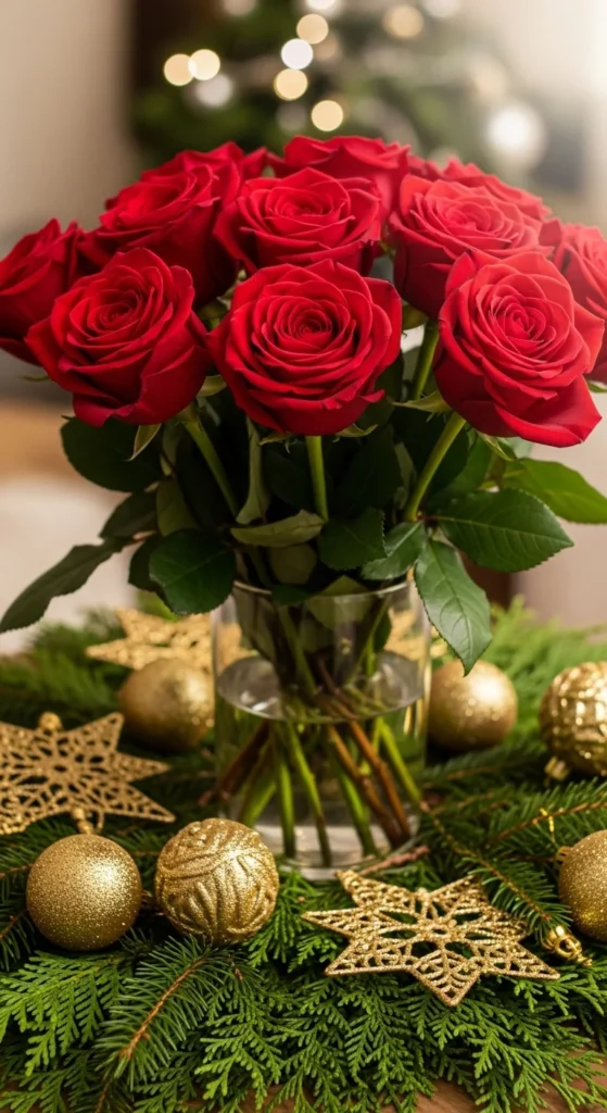 Red roses add a romantic, timeless touch to holiday décor. Pair them with pine, eucalyptus, or holly for a seasonal look. Keep stems trimmed and water clean to extend their life. A simple vase of roses can brighten a mantel or dinner table with elegance and color.