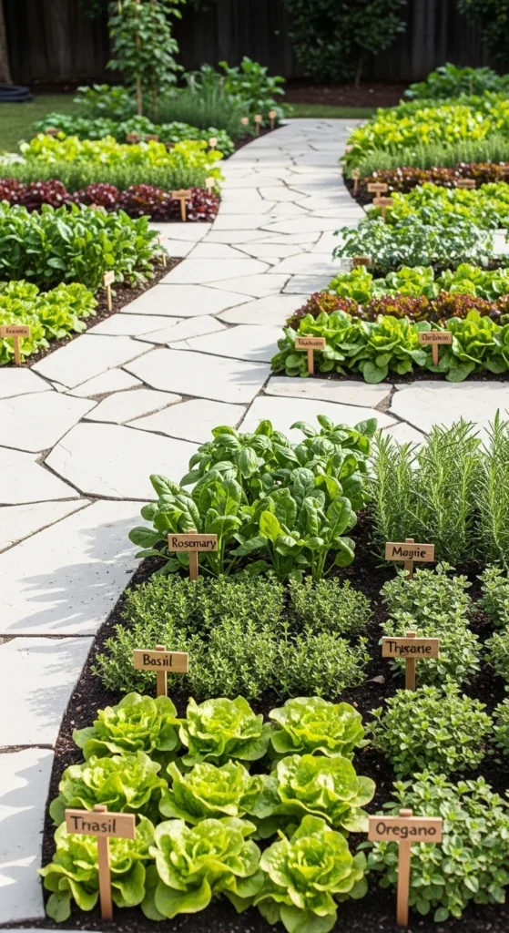 Plant low herbs like thyme or compact lettuce along walkways.