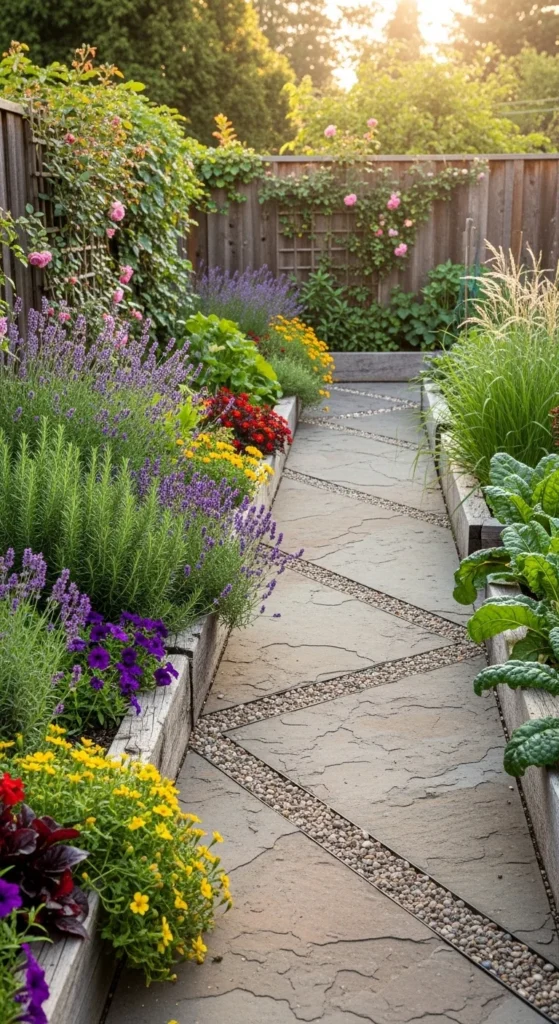 Straight paths can make small yards feel boxy. A 45-degree diagonal path visually stretches the space.