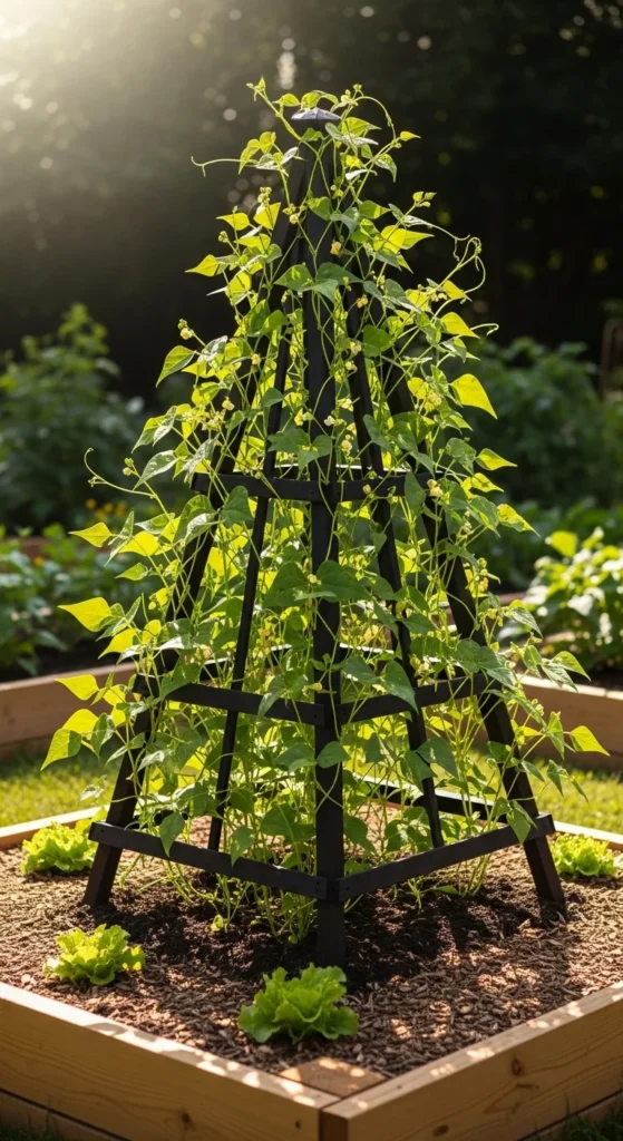 Plant cucumbers or pole beans at the base.