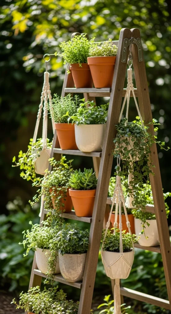 Ladder stands stack pots upward. They work well on patios and balconies. Wooden ladders cost little and fold away when not in use.