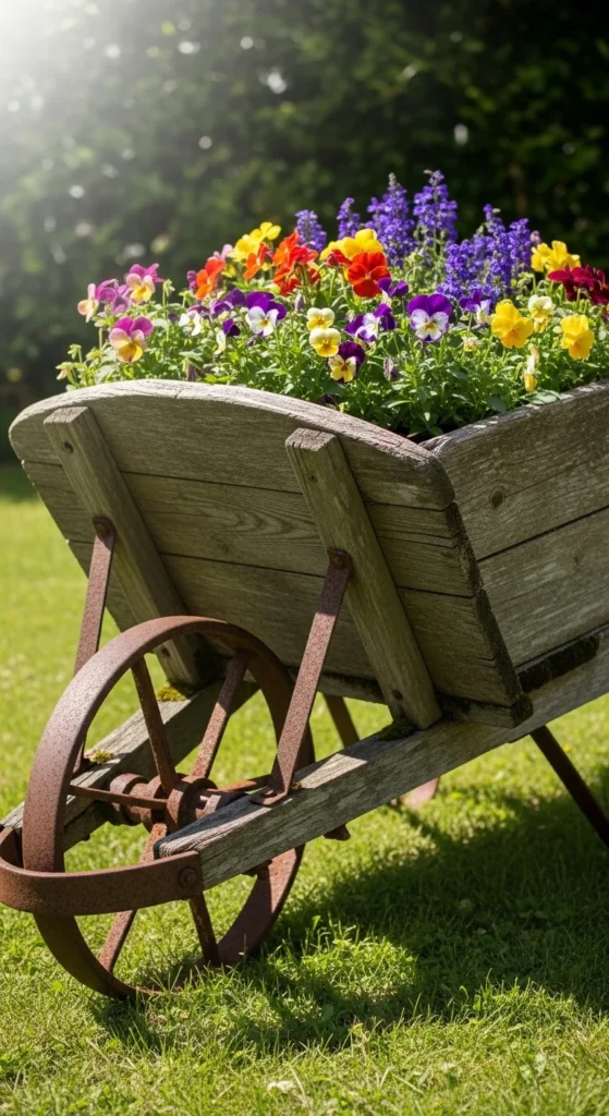 Old wheelbarrows make mobile planters. Drill drainage holes and line with fabric. Fill with soil and plants.