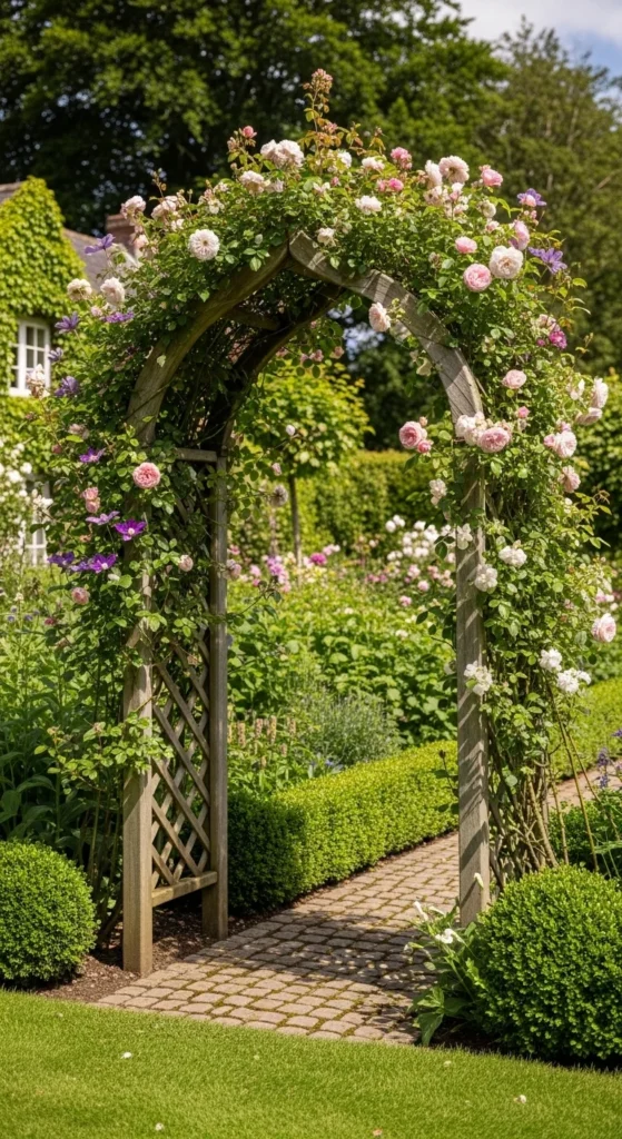 Arched trellises mark transitions between spaces. They add height and structure without crowding.