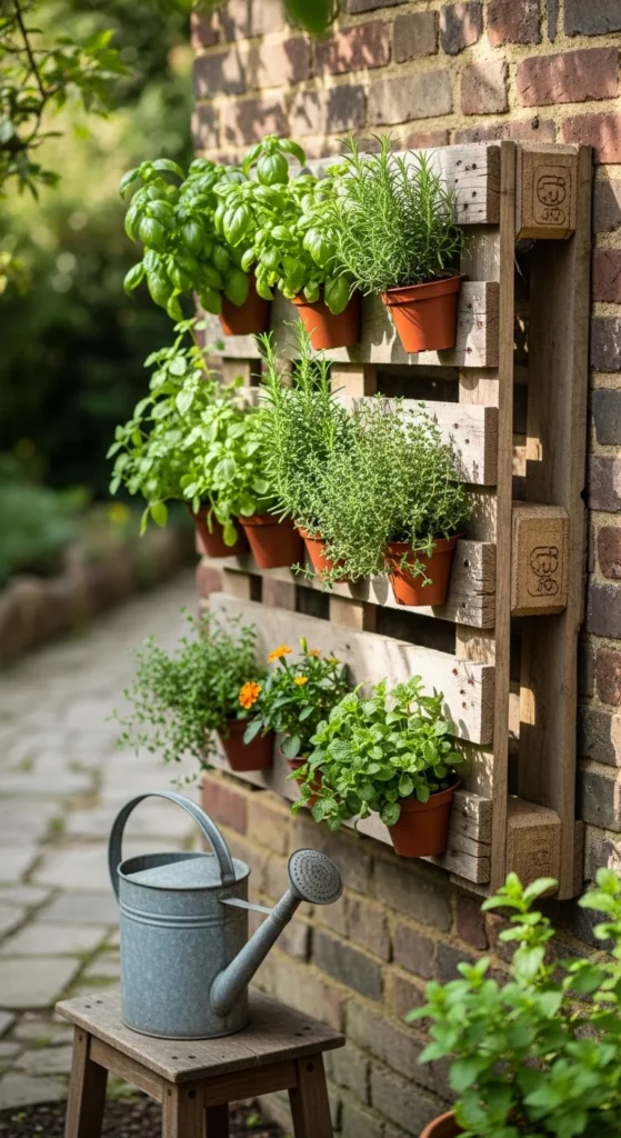 Wood pallets work as vertical herb gardens. Line the back with fabric. Fill gaps with soil and herbs.
