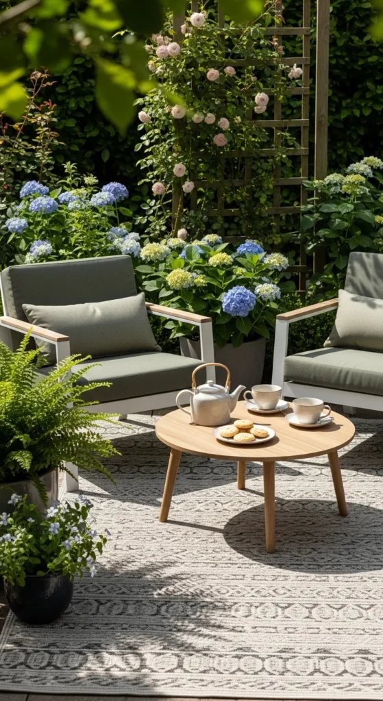 Outdoor rugs define seating zones. They add comfort without building walls.