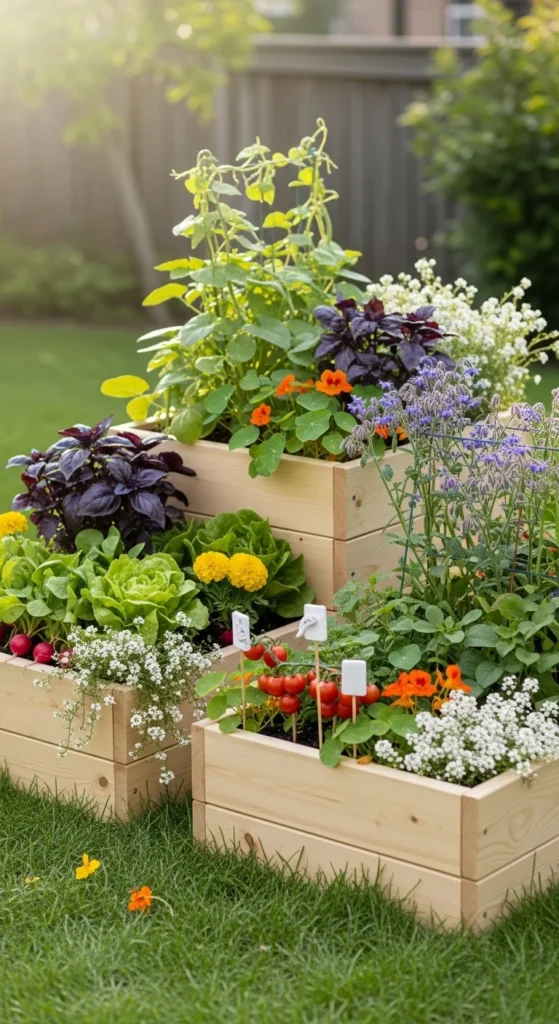 Potager beds mix food and flowers. This keeps gardens useful and attractive. Flowers help attract insects that support growth.