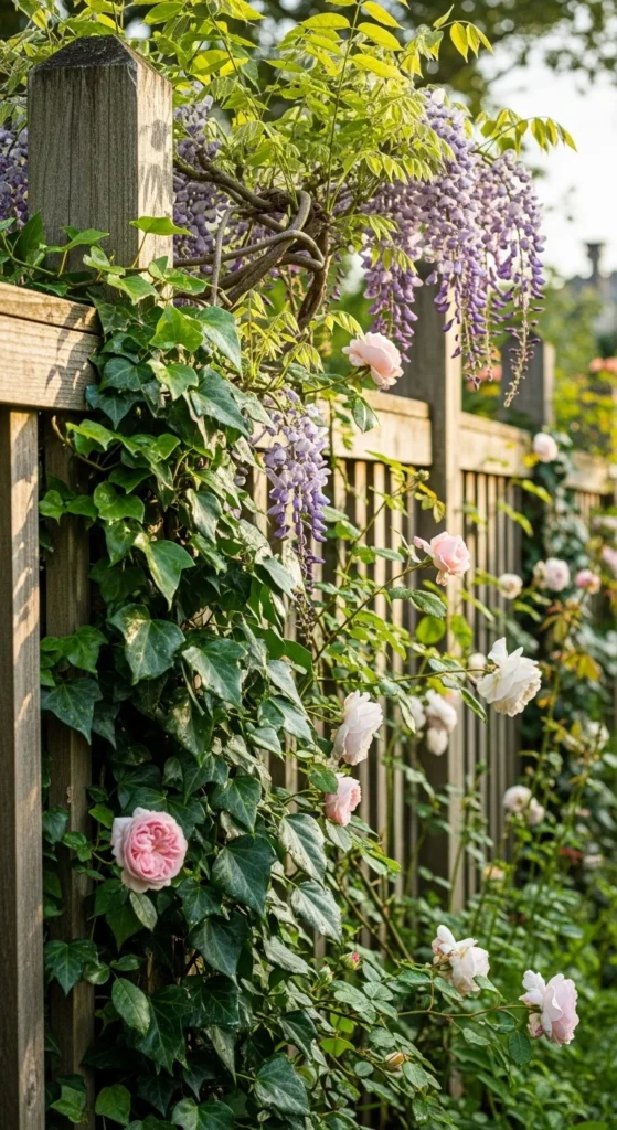 Fast-growing climbers fill gaps quickly. Train them early so growth stays tidy. This adds privacy and shade.