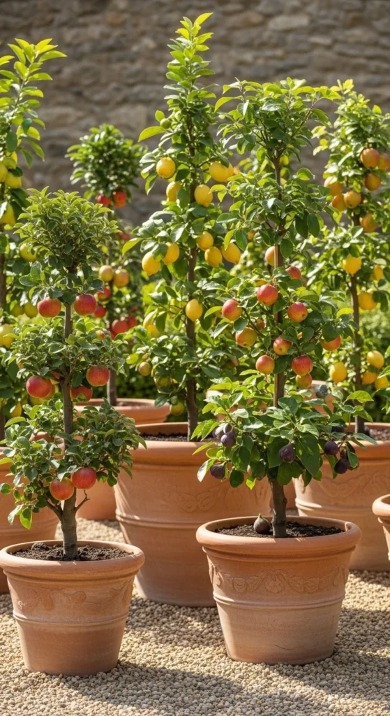 Dwarf fruit trees grow well in containers. They suit patios and small yards. Large pots hold moisture longer and reduce watering.