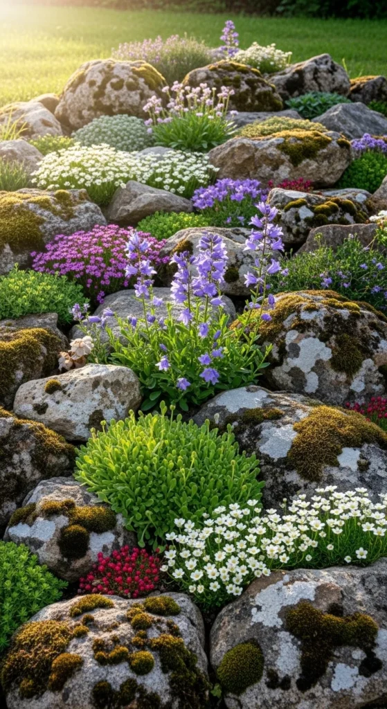 Rock gardens handle uneven ground. Stones hold soil and reduce erosion. Alpine plants and succulents handle dry conditions.
