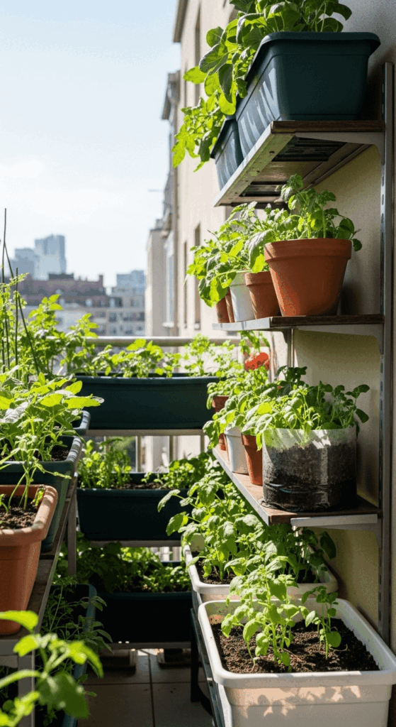 Vertical shelves are one of the easiest ways to multiply growing space in a tiny area. Instead of spreading pots across the floor, the garden rises upward. That leaves more walking room and keeps the balcony or patio from feeling crowded. A simple shelf can hold herbs on top, leafy greens in the middle, and trailing plants below.