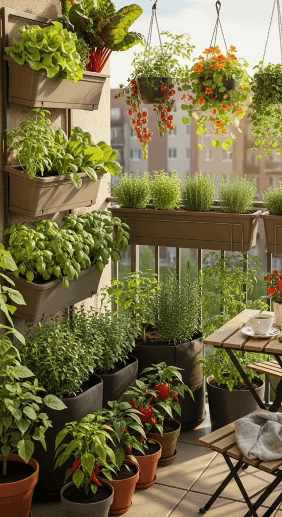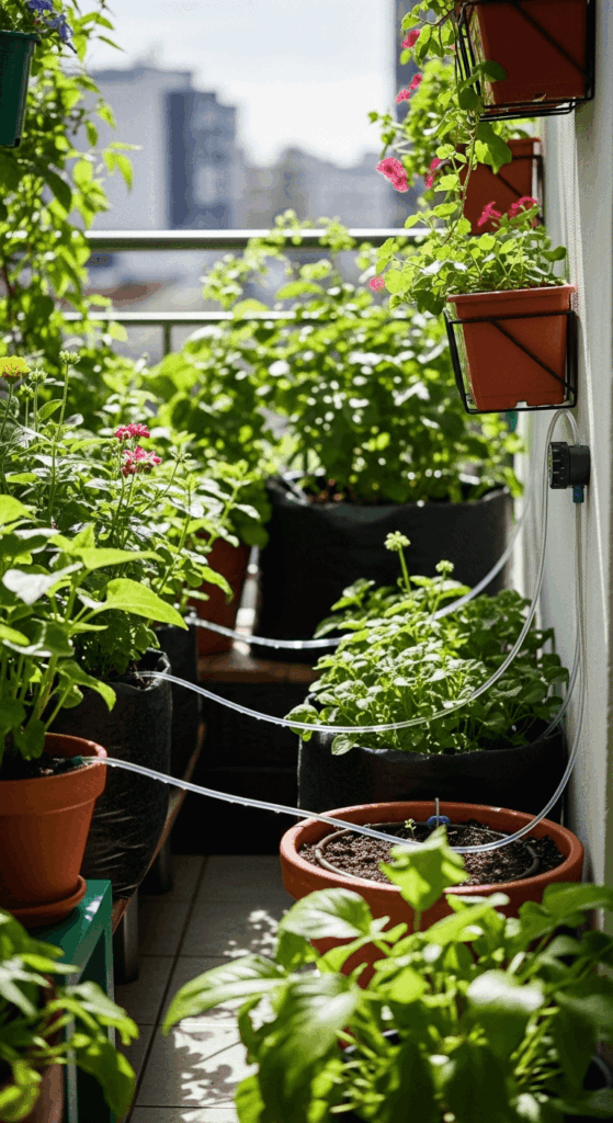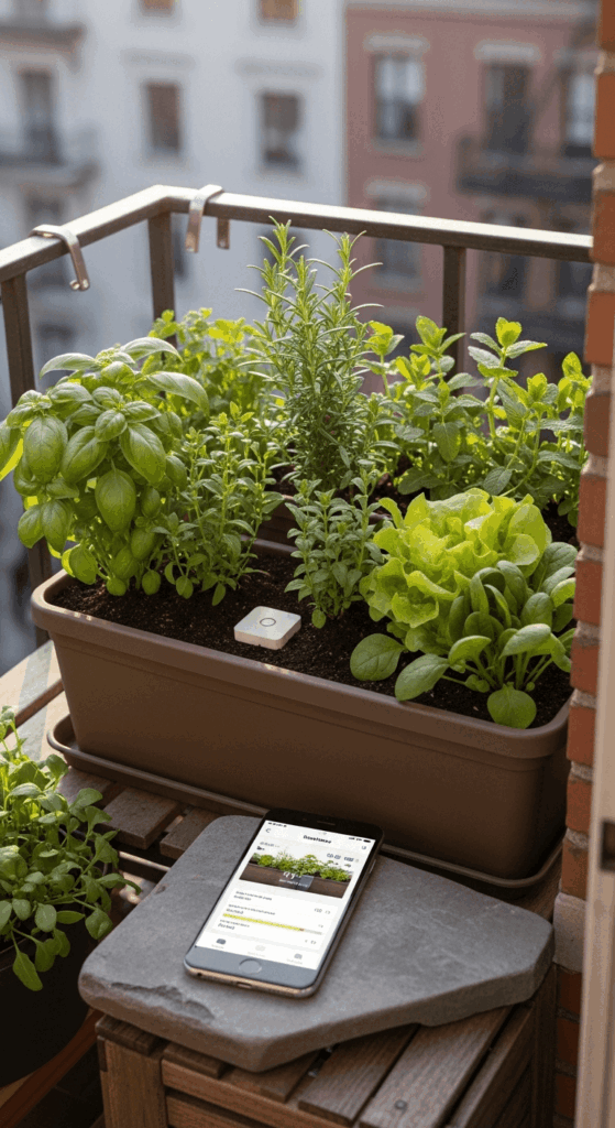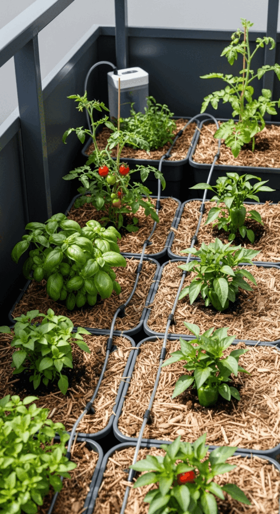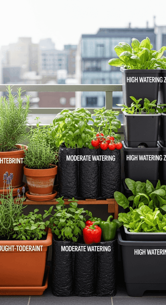 Use one side of the balcony or one tray for thirstier crops and another for drier herbs. Self-watering planters can hold the first group, while terracotta or standard pots work well for the second. This avoids the common problem of overwatering one plant while trying not to underwater another.