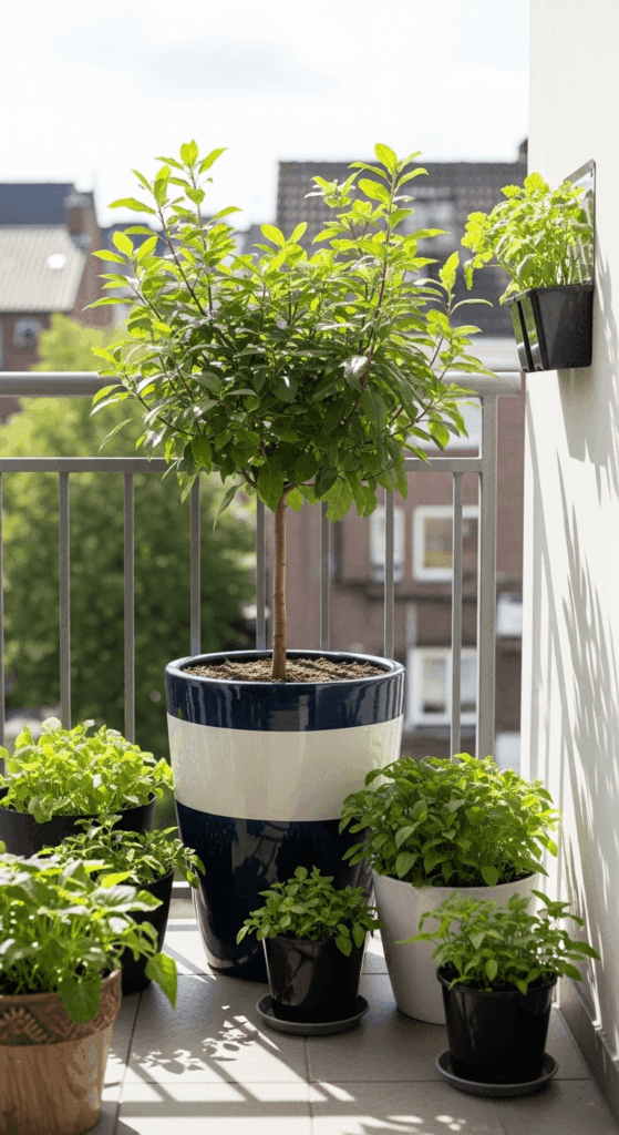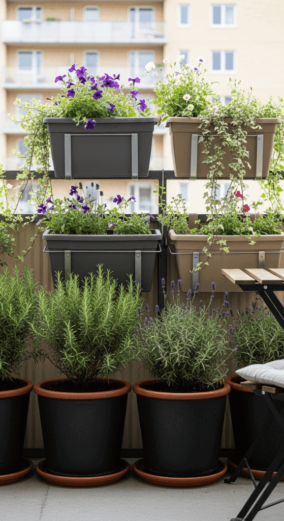 Balconies and patios often deal with wind, narrow space, and safety concerns. One simple way to make the garden more stable is to place heavy pots low and keep light containers on shelves, rails, or higher positions. This reduces tipping risk and makes the whole setup feel more secure.