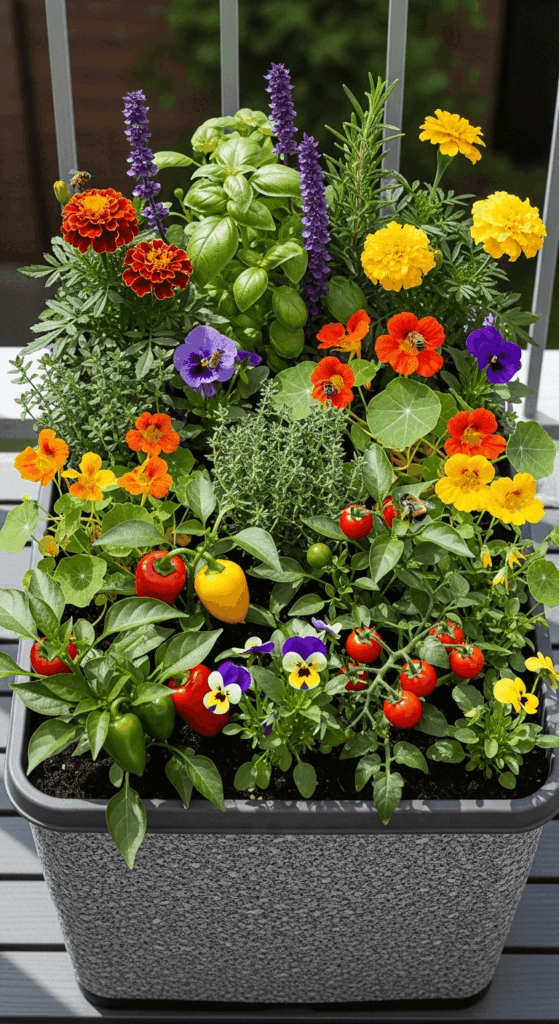 This works especially well in larger containers or troughs where one main edible crop has room for a supporting flower at the edge. The flowers can soften the look of the pot and make the area feel more like a real garden. They may also help draw in helpful insects when the outdoor location allows.