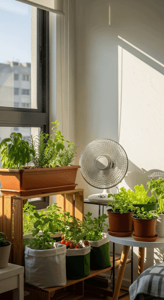 Outdoors, avoid packing pots so tightly that leaves are always pressed together. Indoors, a gentle fan can help herbs and greens stay stronger. On balconies, raising some pots slightly or placing them where air can move through the group also helps. This does not need to be dramatic. Small changes in spacing can make a big difference.