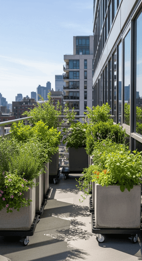 A low-cost system is as simple as keeping plants in light enough containers to move by hand. Plastic pots, resin planters, and medium grow bags are useful here. Rolling trays also help with larger containers. Watch how the light changes through the day before locking the layout in place.