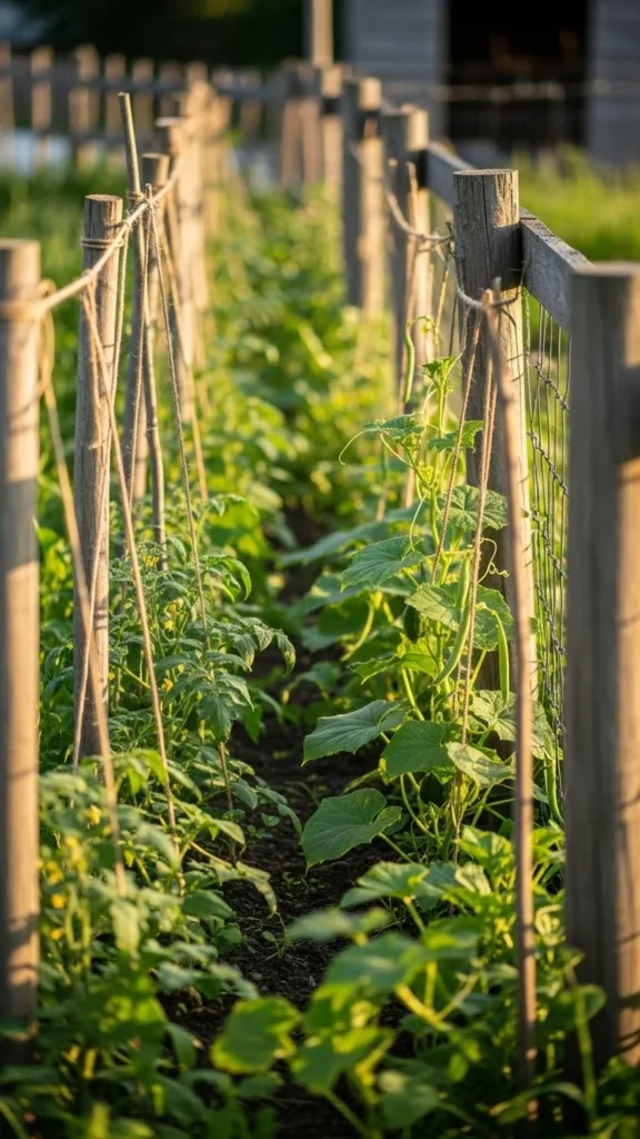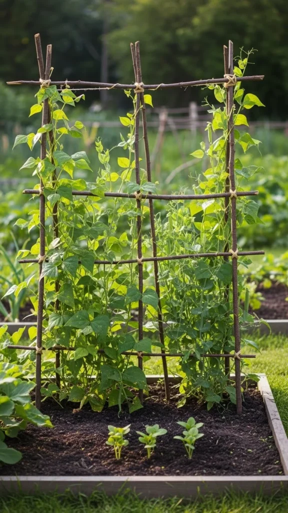 Vertical growing saves ground space. Crops like beans, peas, and cucumbers climb easily when given support. A basic trellis made from sticks, bamboo, or old fencing works well.