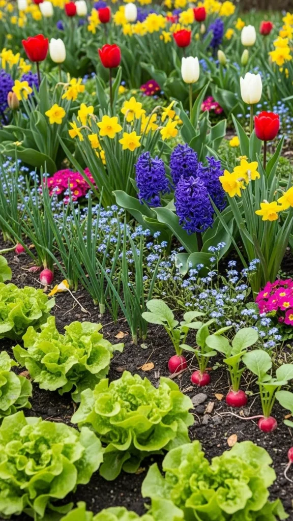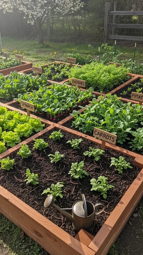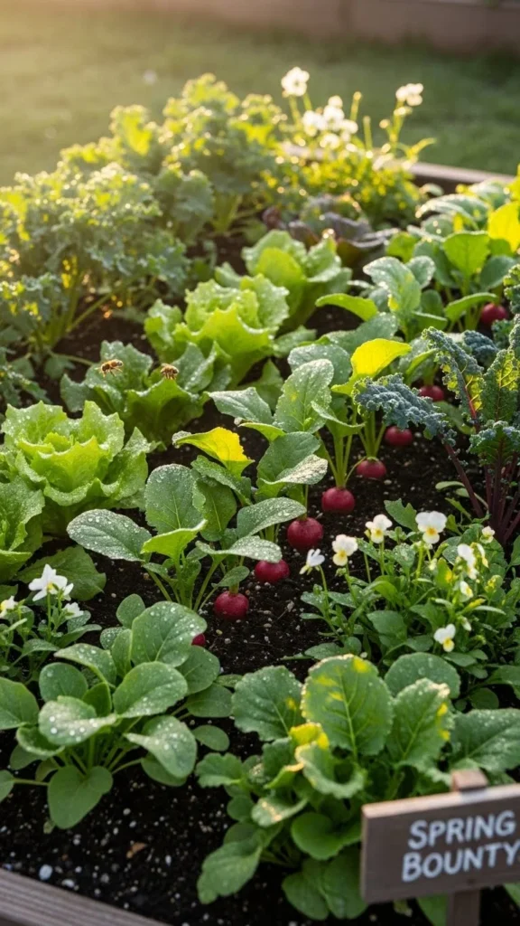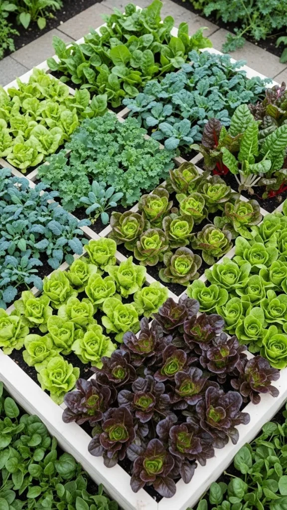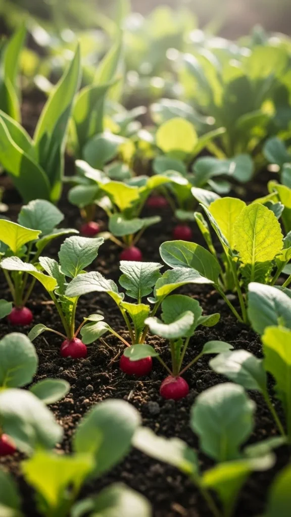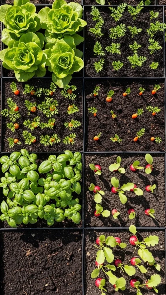 Fast-growing crops fill gaps while slower plants mature. Radishes and greens fit well between larger crops.