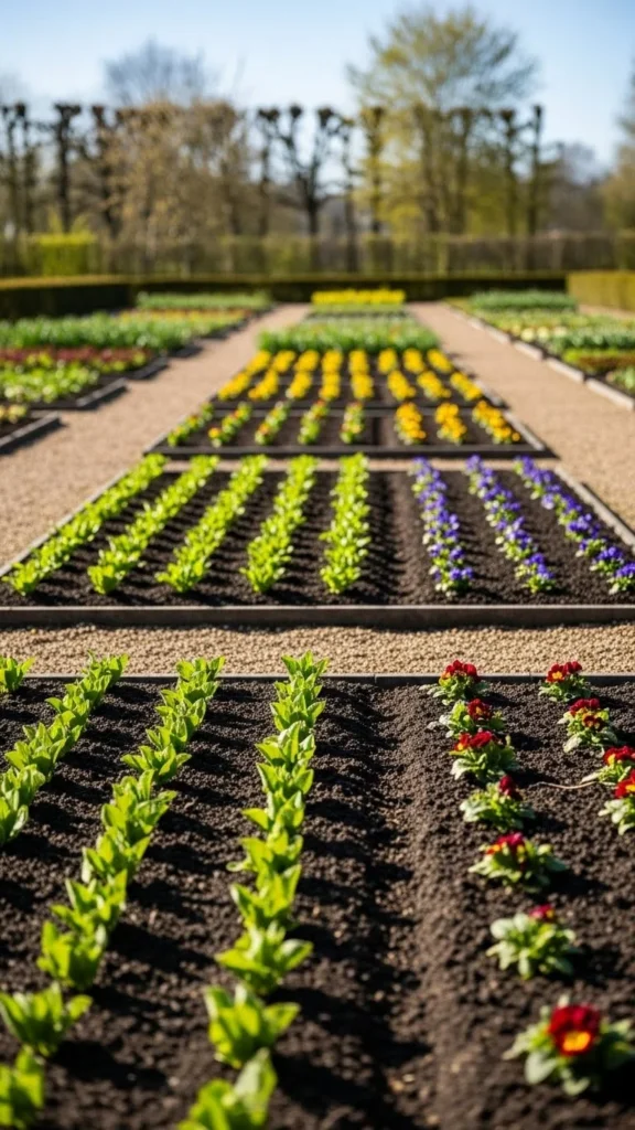 Combining crops saves space. Flowers fit between vegetables without taking extra room. Use borders or gaps between rows.