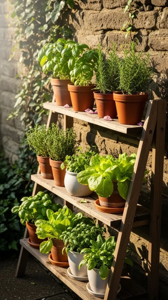 Repurpose old ladders or crates. Vertical shelving keeps plants accessible while freeing ground below.