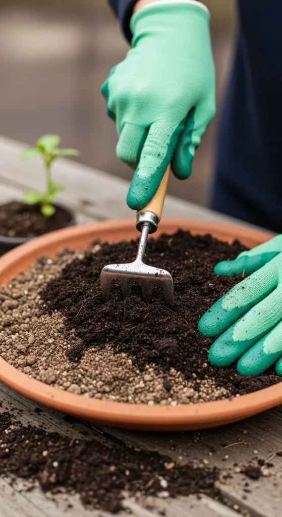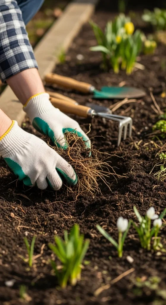 Before adding anything to the soil, clear out what no longer belongs. Old roots, dead stems, and leftover plant matter block airflow and slow new growth. Use your hands or a small fork to loosen debris without digging deep.