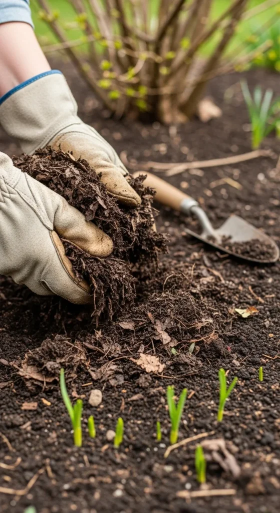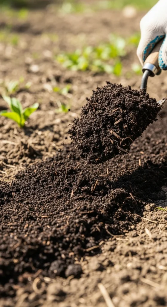 If compost is limited, focus on planting rows and visible beds first. Even partial coverage improves results.