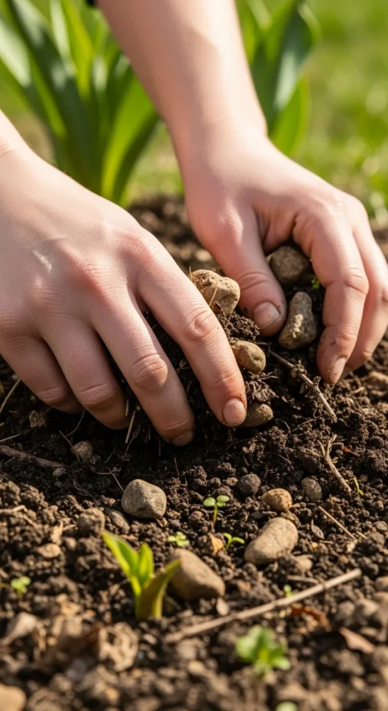 Rocks and debris interrupt root paths and water flow. Remove visible stones while soil is loose.