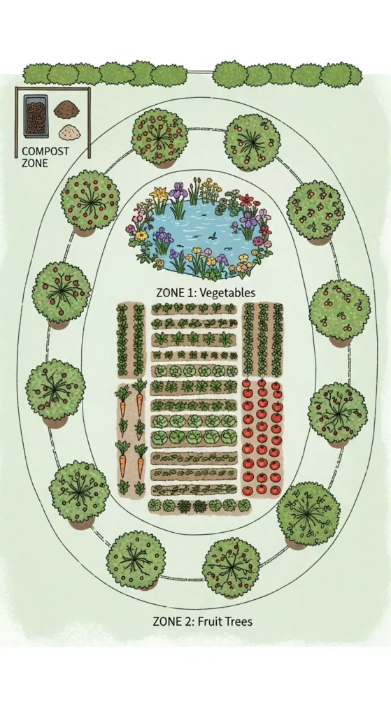 • Zone 1: Nearest to your home — herbs, salad greens, and daily-use plants.