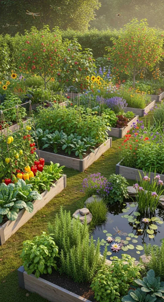 This design creates an ecosystem where every element — plants, animals, water, and soil — supports the others.