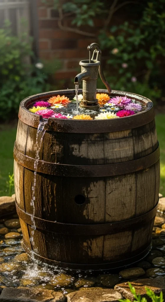 Turn a rustic barrel into a water feature. Line it with a waterproof liner and add a small pump. Float water plants or flowers for decoration. It’s durable and perfect for farmhouse gardens or patios.