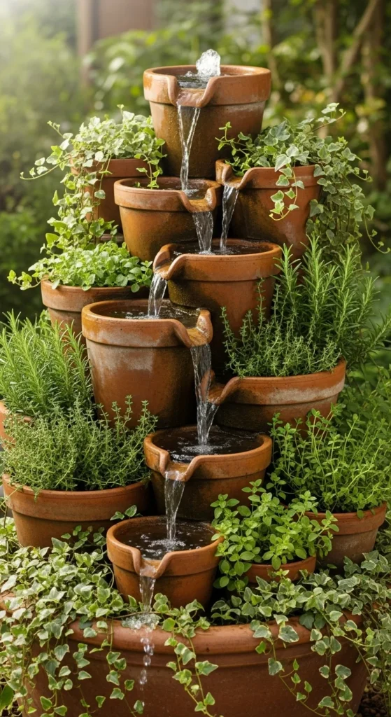 Terracotta pots are affordable and easy to find. Stack them in layers so water cascades down. It’s a simple weekend project that adds earthy charm. Use silicone to seal leaks and keep it near your herbs for a Mediterranean touch.