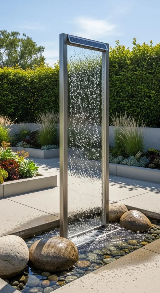 Solar-powered walls create visual drama while saving energy. The water flows over a smooth surface, catching sunlight beautifully. It’s ideal for modern designs where space and efficiency matter.