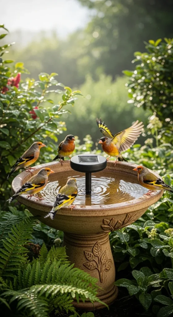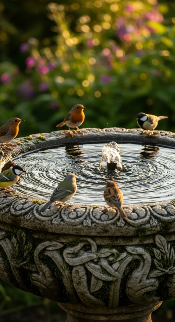 Upgrade a simple bird bath with a bubbler. The moving water stays cleaner and attracts more wildlife. Choose a sturdy stone base for durability and position it near shrubs for safety and shade.
