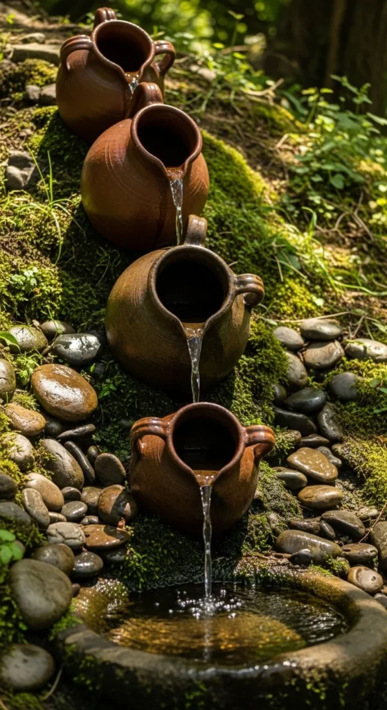 Arrange old jugs or pitchers to create a cascading flow. It looks rustic and creates a soft, layered sound. Add moss or creeping plants nearby for a natural finish.