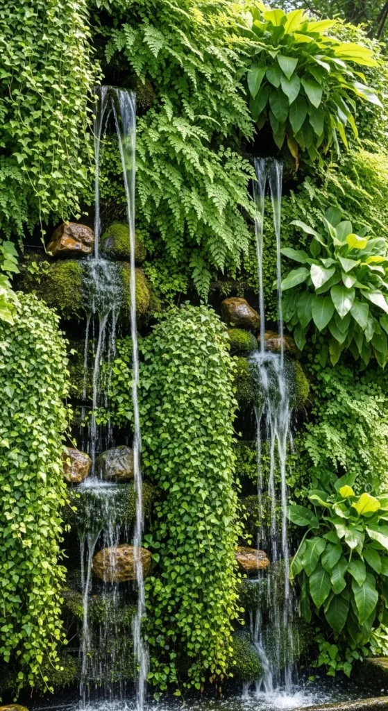 Combine greenery and water for a living wall effect. Add small waterfalls between plant pockets for constant motion. It’s a refreshing focal point that cools down your garden space.