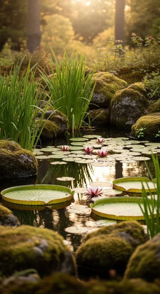 Build a small pond using natural stones for the border. Add reeds and floating plants for texture. The reflections of sky and trees give it an organic, timeless beauty.